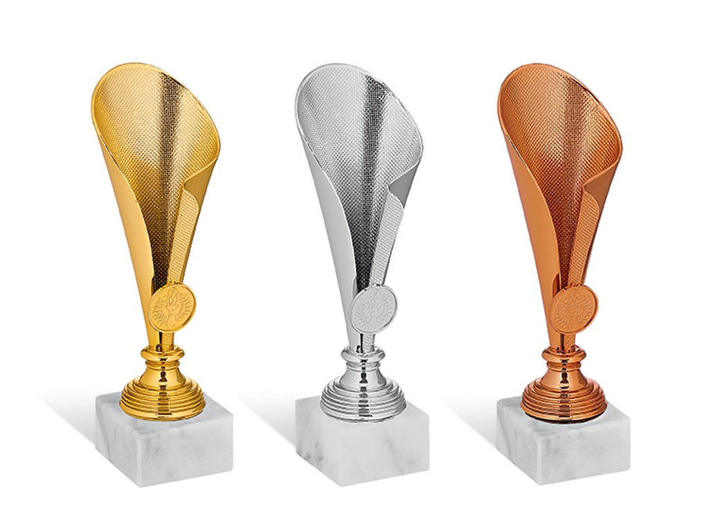 Zlatý, strieborný a bronzový plastový pohár na mramorovom podstavci na ktorý je možné umiestniť štítok a emblém o Ø 25 mm.