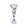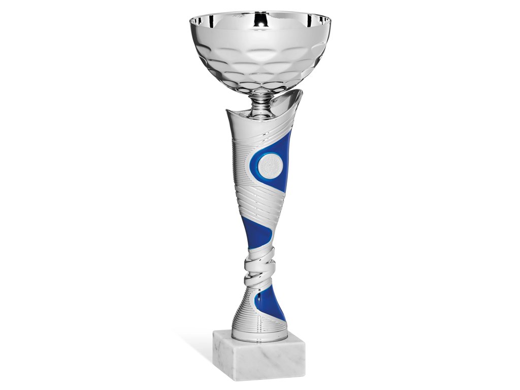 Strieborný kovový pohár so strieborno-modrou plastovou stopkou na mramorovom podstavci na ktorý je možné umiestniť štítok s textom a emblém o Ø 25 mm. Pohár je dostupný v troch veľkostiach.