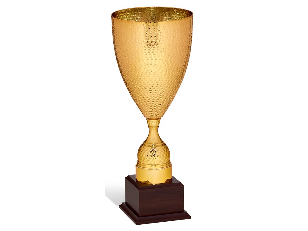 Zlatý kovový pohár na drevenom podstavci na ktorý je možné umiestniť štítok s textom. Pohár je dostupný v troch veľkostiach.