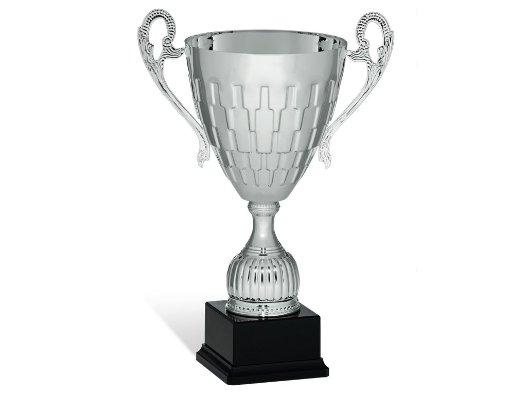 Strieborný kovový pohár s uškami na plastovom podstavci na ktorý je možné umiestniť štítok. Pohár je dostupný v ôsmich veľkostiach.