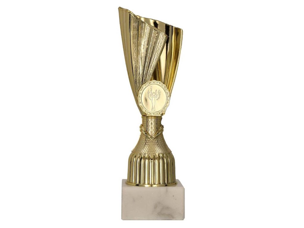 Zlatý plastový pohár na mramorovom podstavci na ktorý je možné umiestniť štítok a emblém o Ø 25 mm.